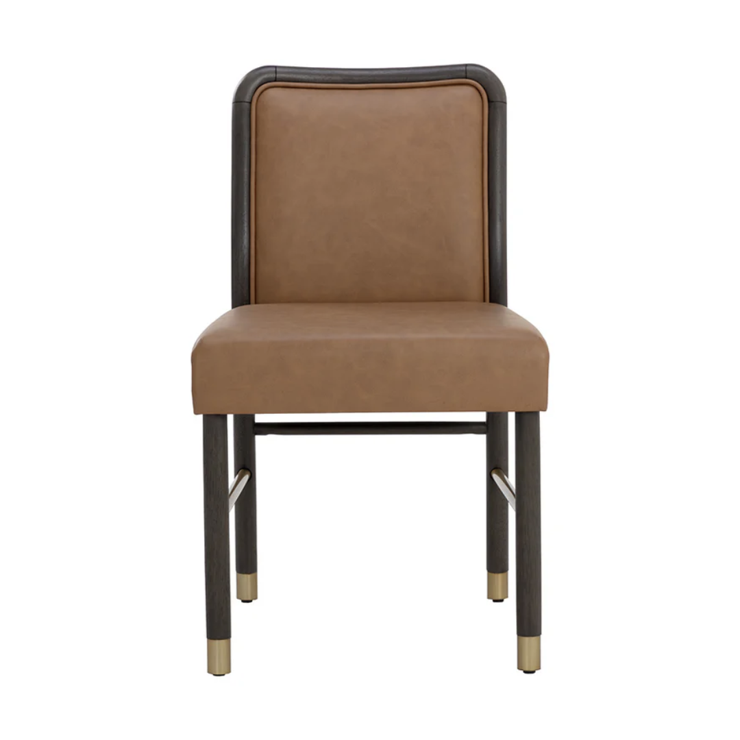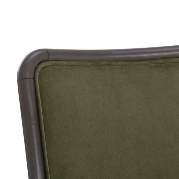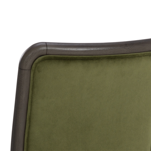 The Jeno Dining Chair is a sophisticated study of mid-century design. A velvet fabric seat in meg olive combined with a smoke grey rubberwood frame gives a striking balance of impeccable style and comfort. Brass metal stretchers and foot caps enhance the overall look. As wood is an organic, porous material, these pieces will contain natural variation of texture and may also exhibit fine indentations and cracks. Wood pieces will also display a disparity of color and grain, and visible knots and burls that add to the character of each piece.
