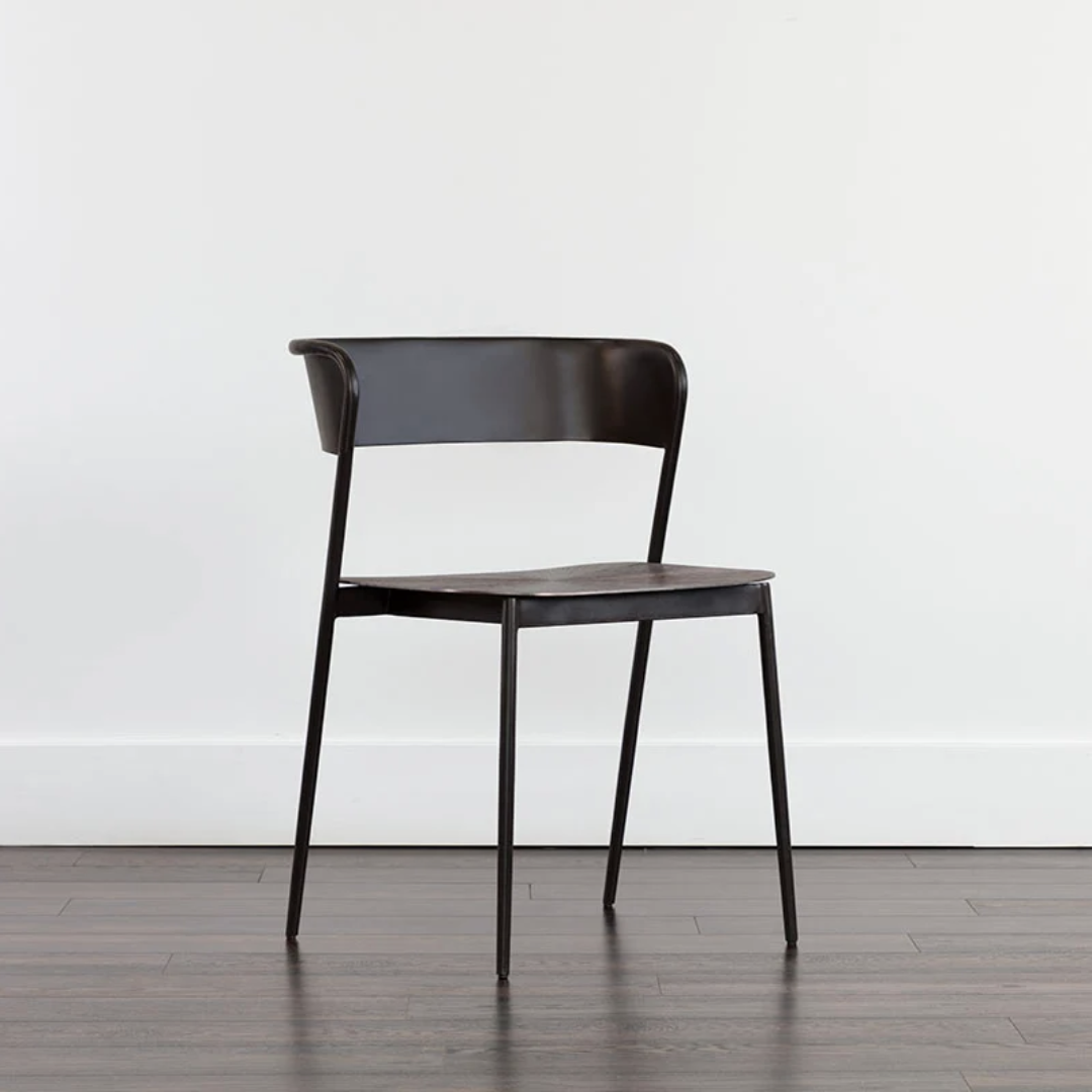 A handsome and sleek dining armchair that features a modern design filled with rich details. Crafted from gunmetal iron with a bronzed finish and completed with a stylish starburst pattern on the seat. Made in India. With refined craftsmanship, this design was brought to life by skilled local artisans. By nature, these materials develop unique imperfections such as fissures, markings and color variations for a truly one-of-a-kind piece.