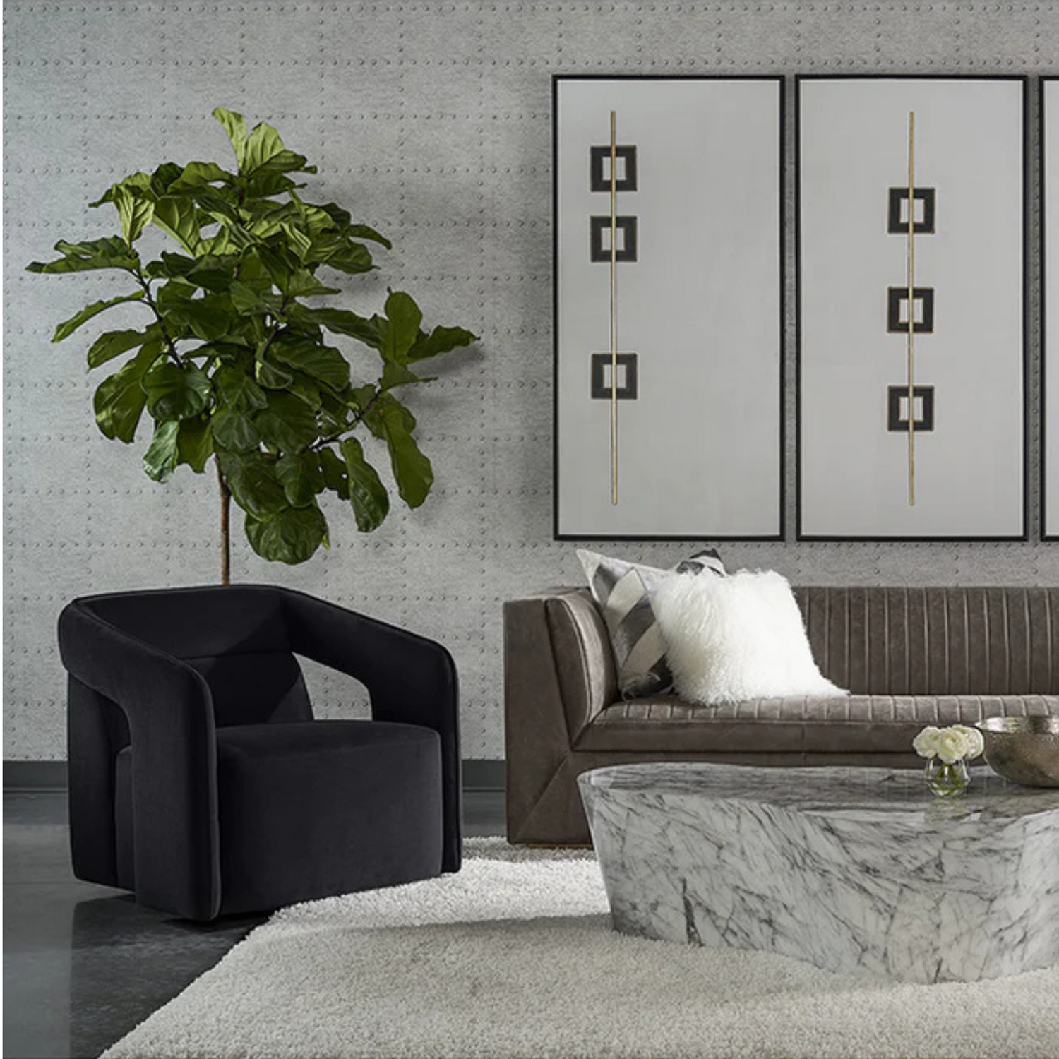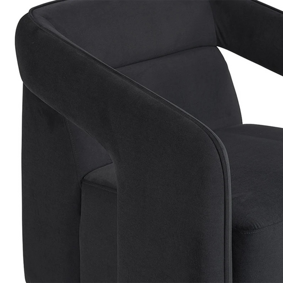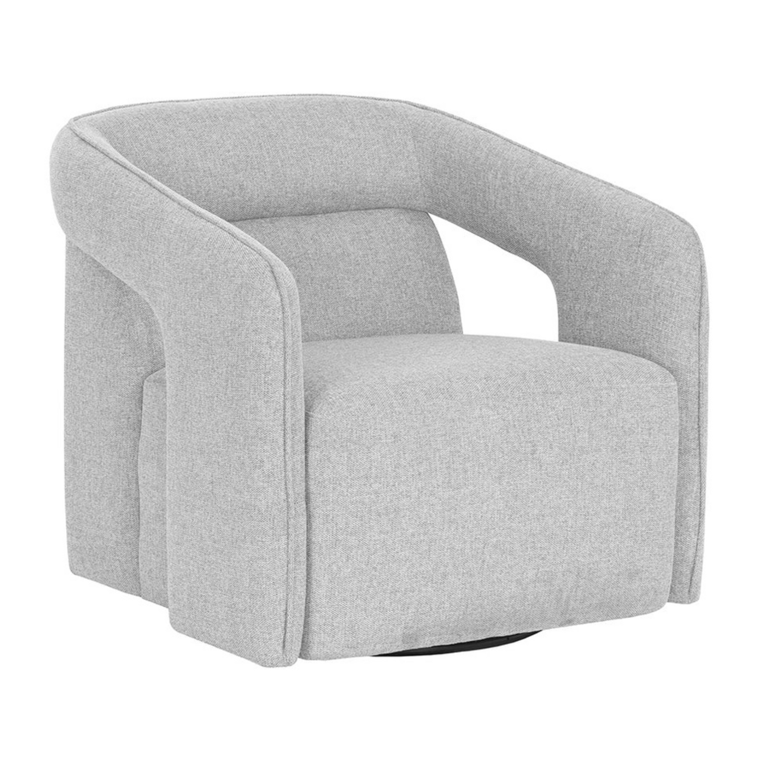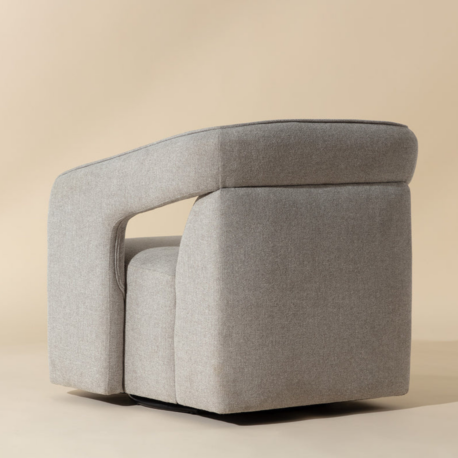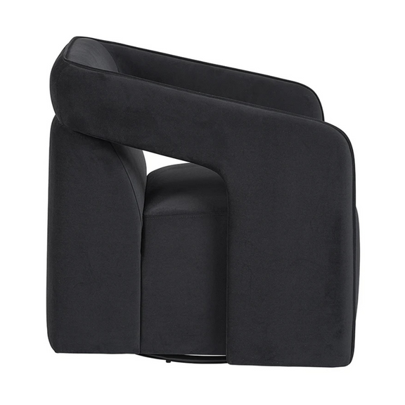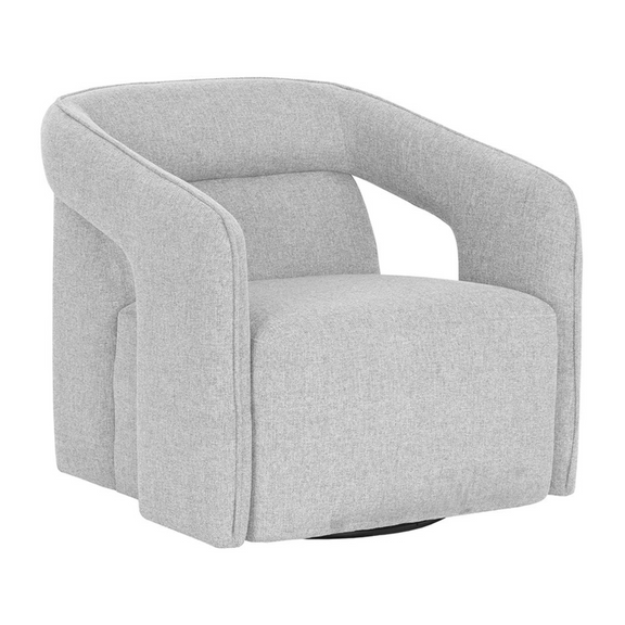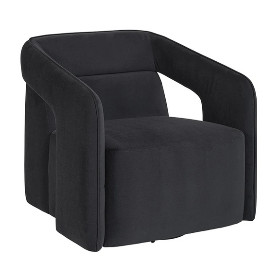 A futuristic swivel chair featuring cut out arms and a large, comfortable seat in abbington black or belfast heather grey fabric.