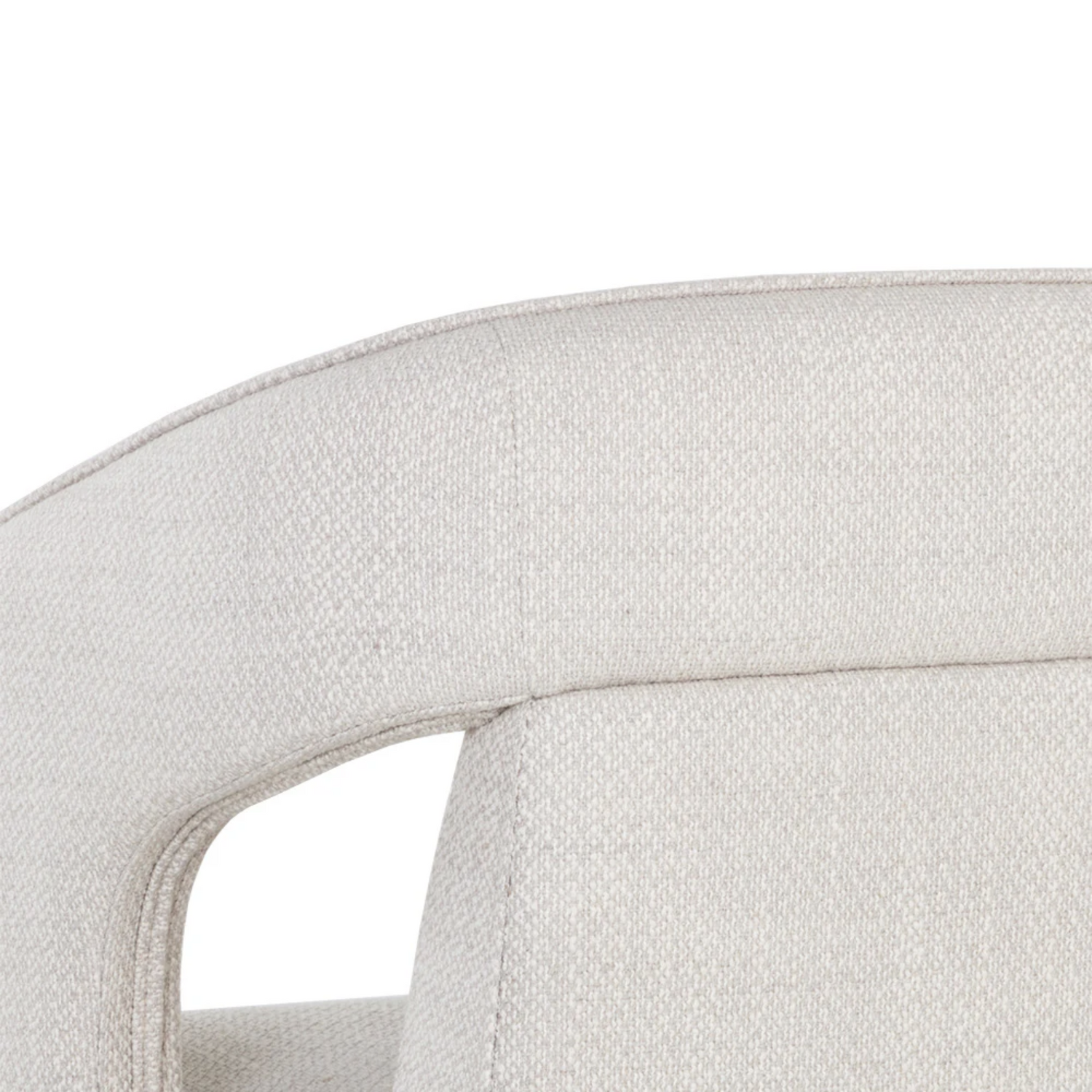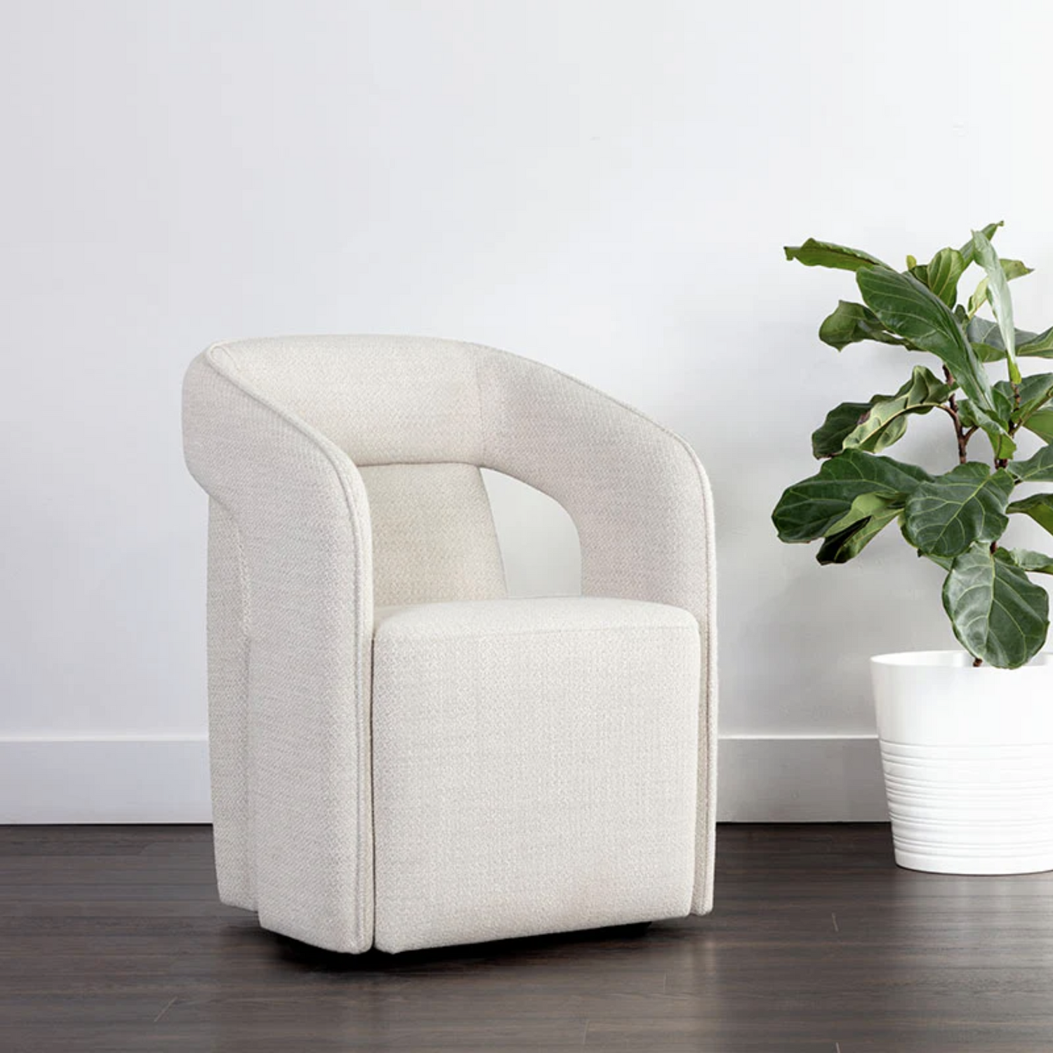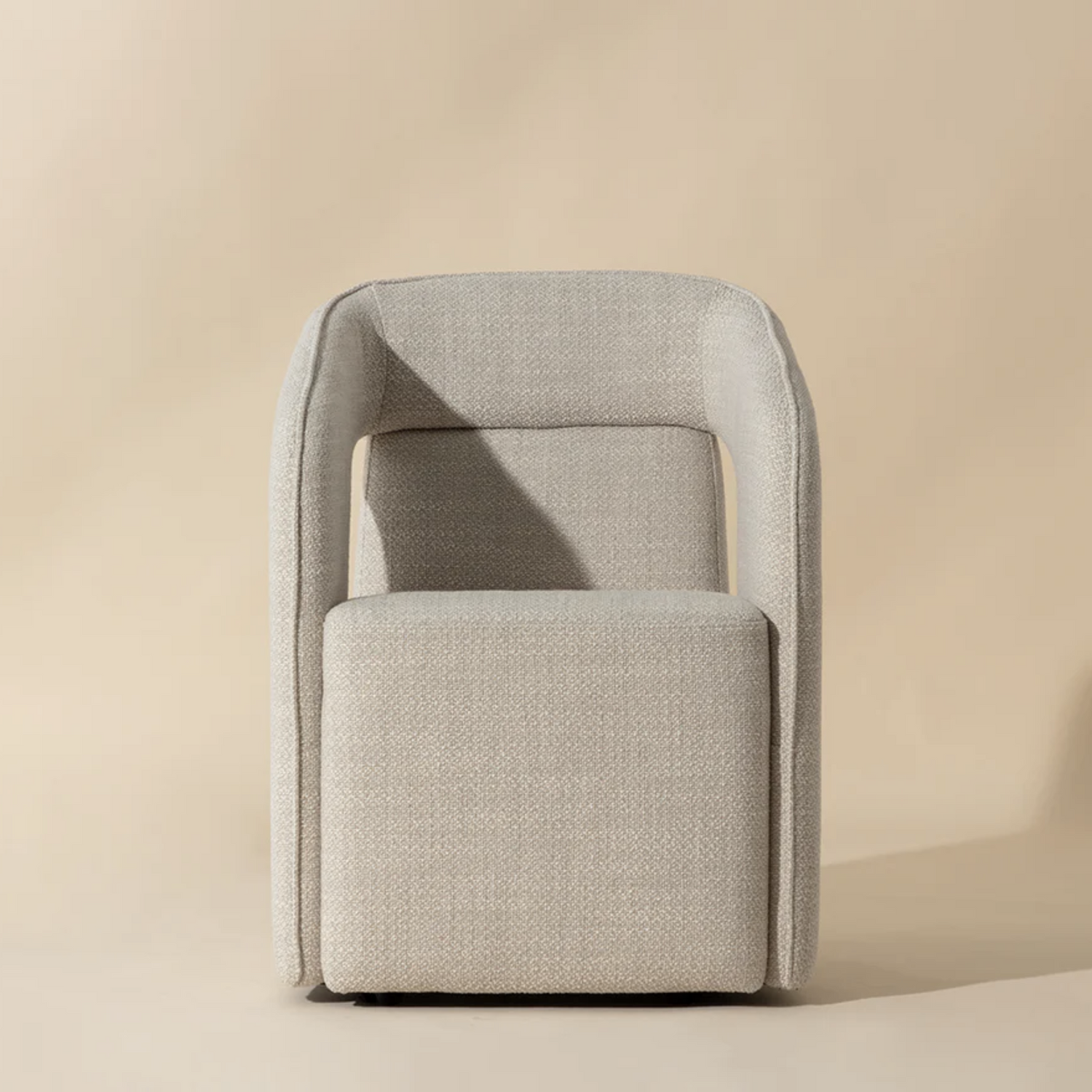 A futuristic wheeled dining armchair featuring cut out arms and a large, comfortable seat. Stocked in moto stucco performance fabric. Performance fabric is moisture repellent, durable and easy to clean.