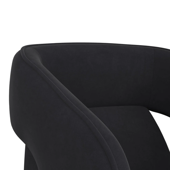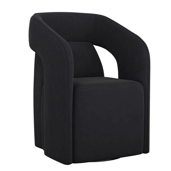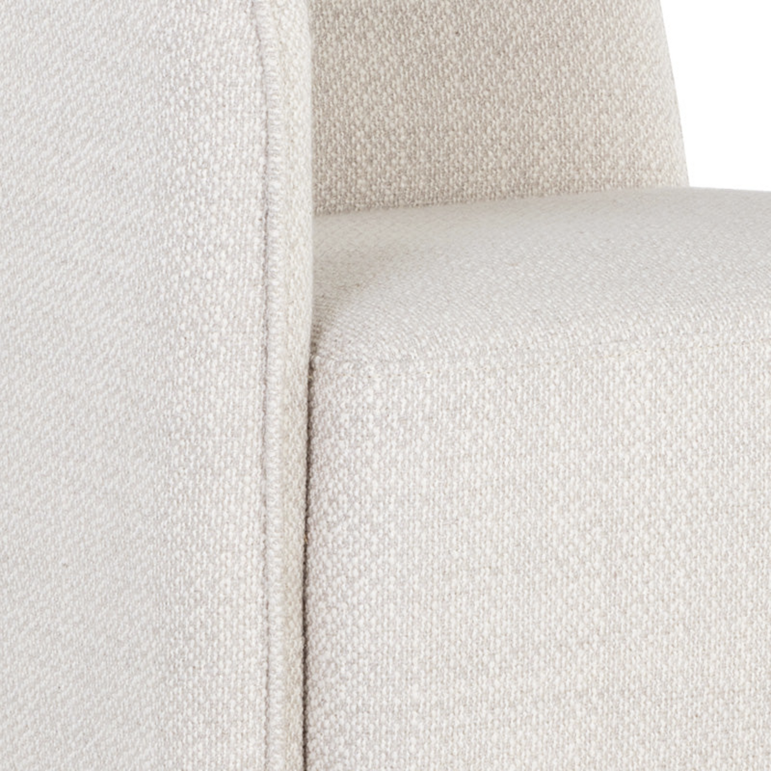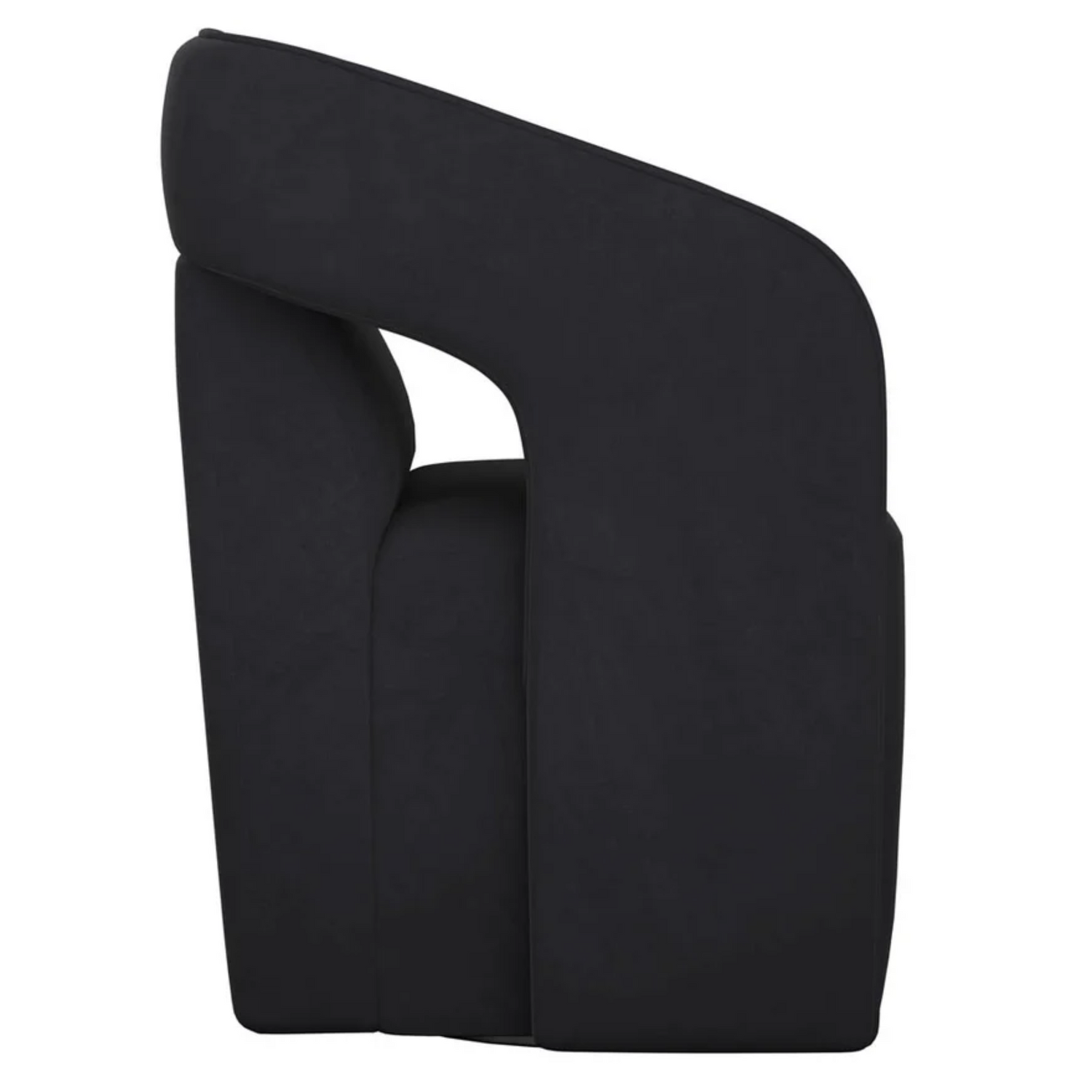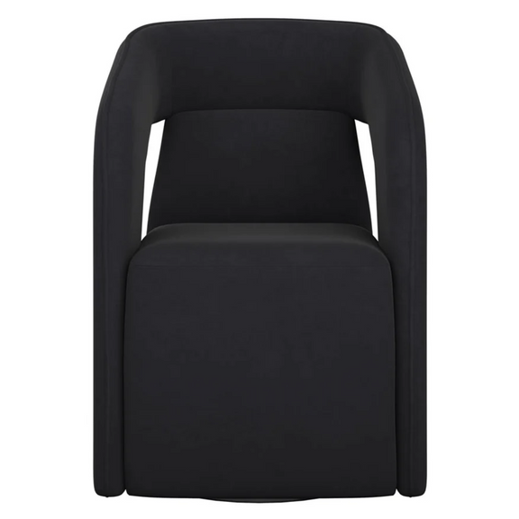 A futuristic wheeled dining armchair featuring cut out arms and a large, comfortable seat. Stocked in moto stucco performance fabric. Performance fabric is moisture repellent, durable and easy to clean.