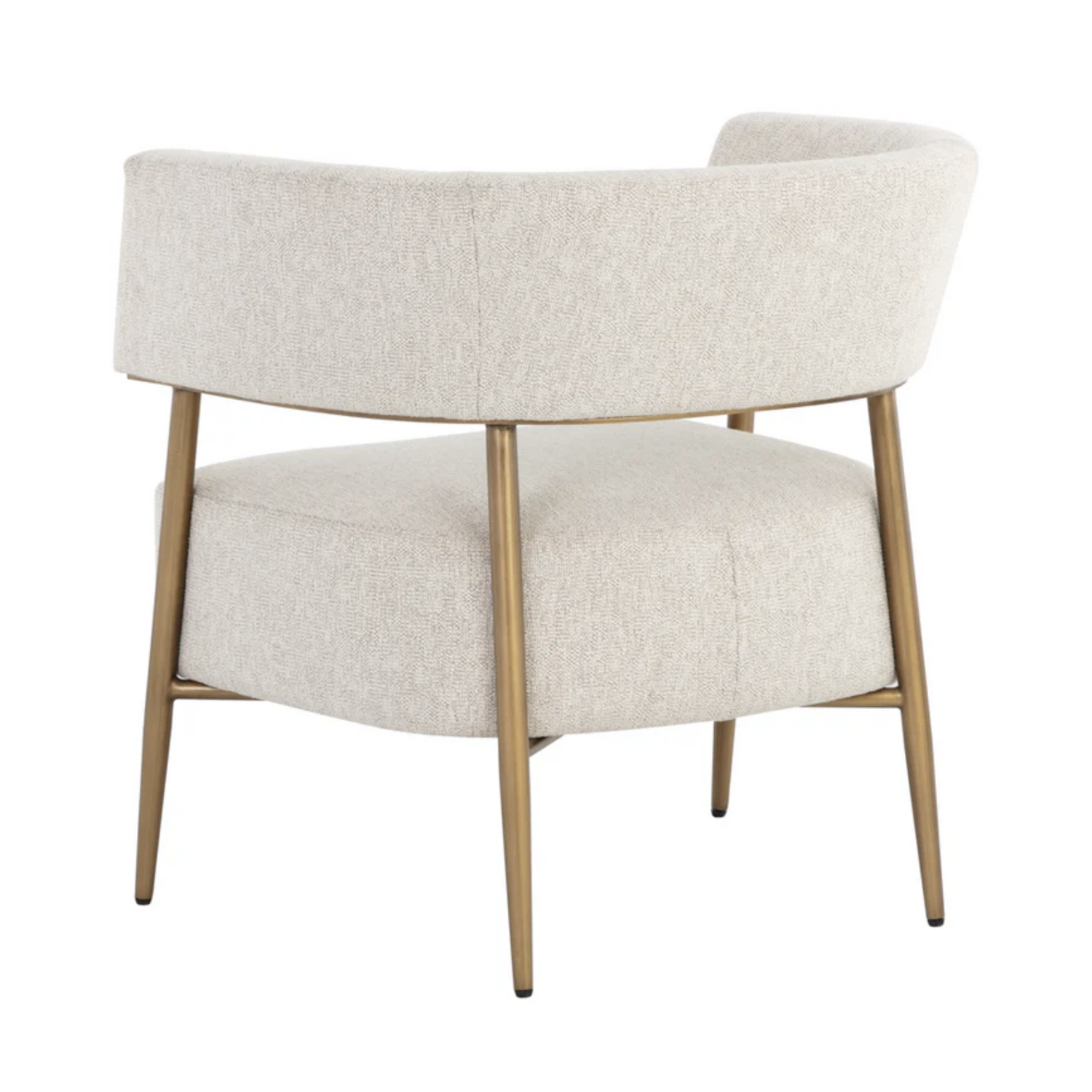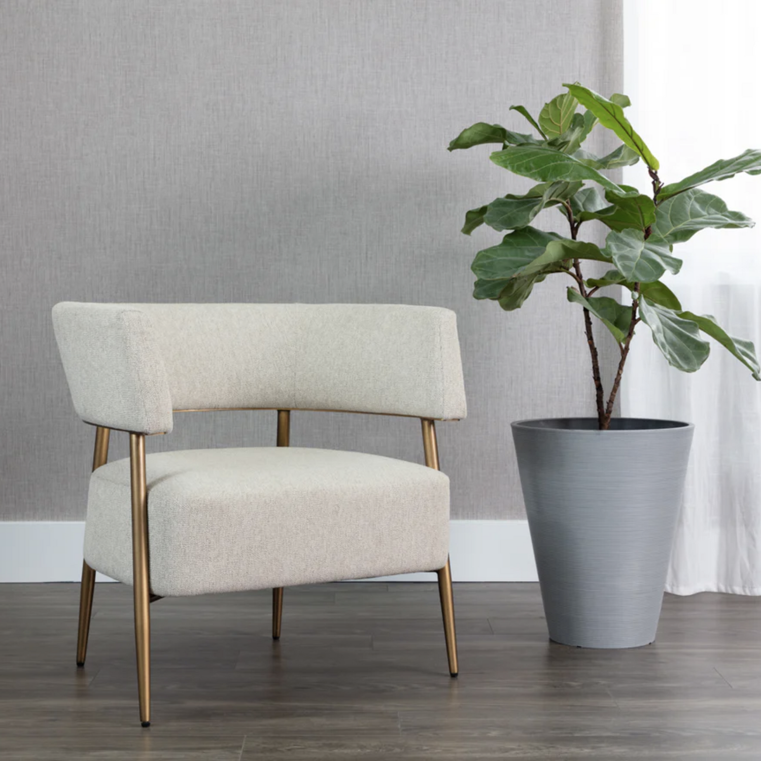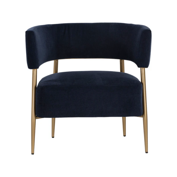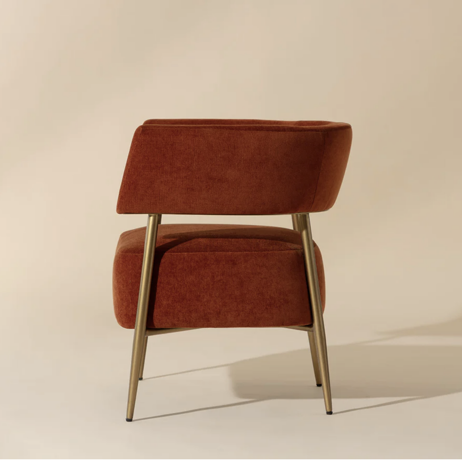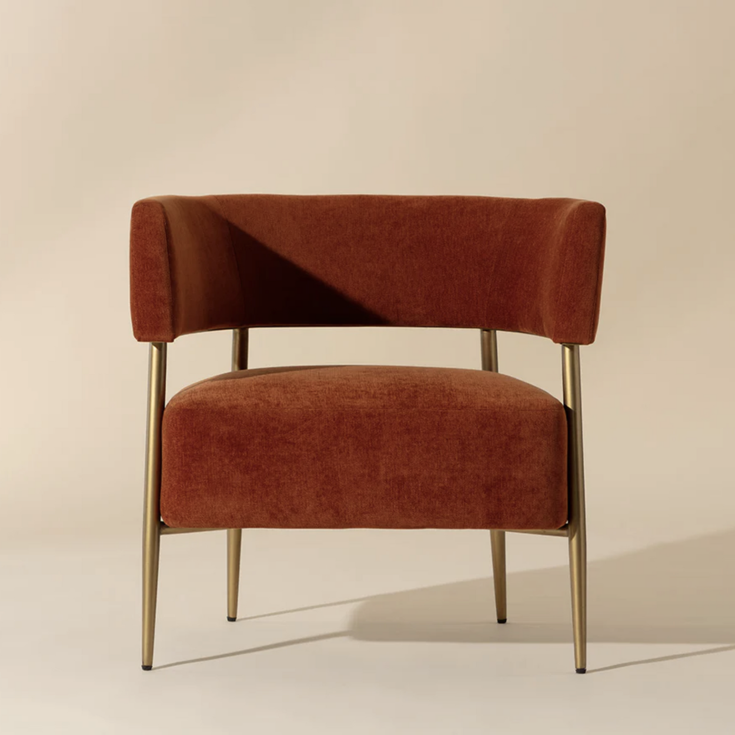 Turn heads with this contemporary lounge chair that exudes extravagance. Features a curved frame and upholstered in our danny rust and navy fabrics. Completed with antique brass legs. Also available in dove cream fabric.