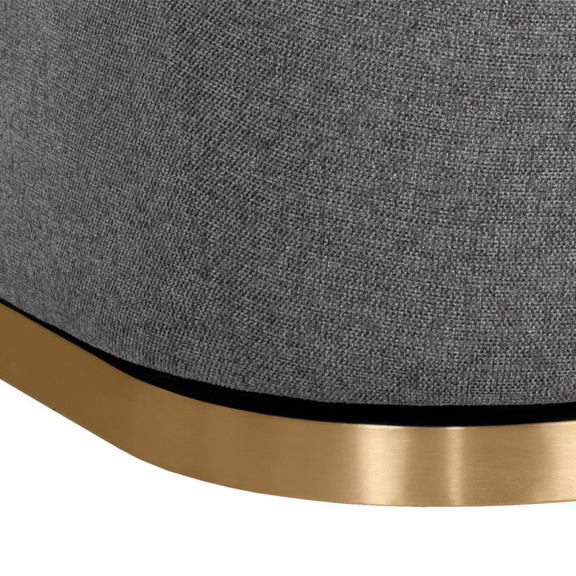 Unwind in style with this fabulous, modern swivel lounge chair that features a smooth curved frame. Stocked in belfast koala grey fabric and completed with an antique brass stainless steel base.
