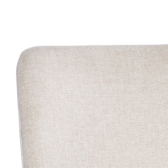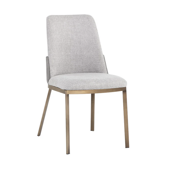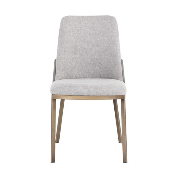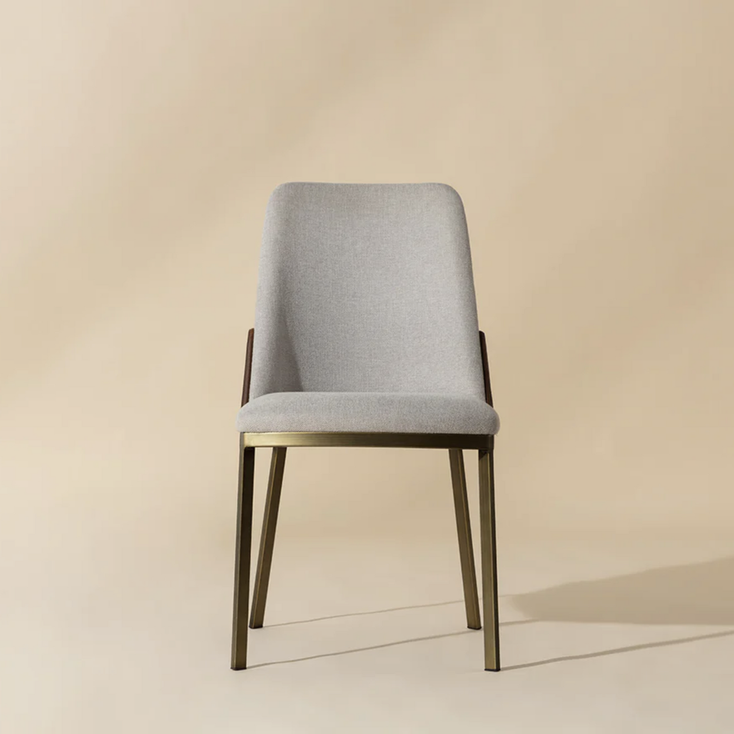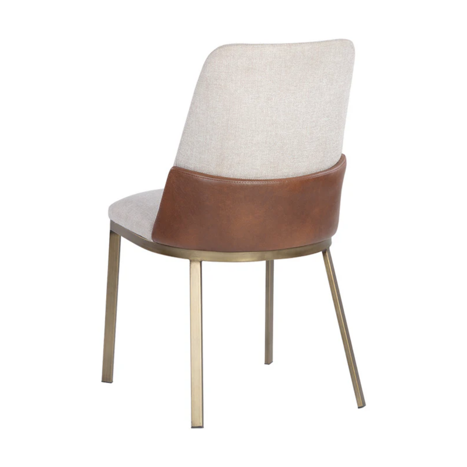 Make a bold statement with this modern dining chair that is full of luxe details. Stocked in belfast oatmeal fabric with accenting on the back in bravo cognac faux leather. Finished with brushed steel legs in antique brass. Handle With Care: This design has been crafted with faux leather. Faux leather is manufactured to reflect the natural characteristics of leather; as such, color variations, markings wrinkles, grooves, and light scratches are appreciated characteristics. No two pieces will be alike.