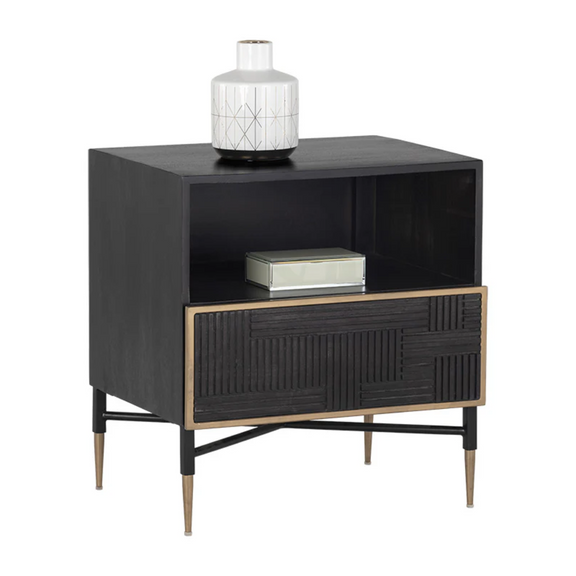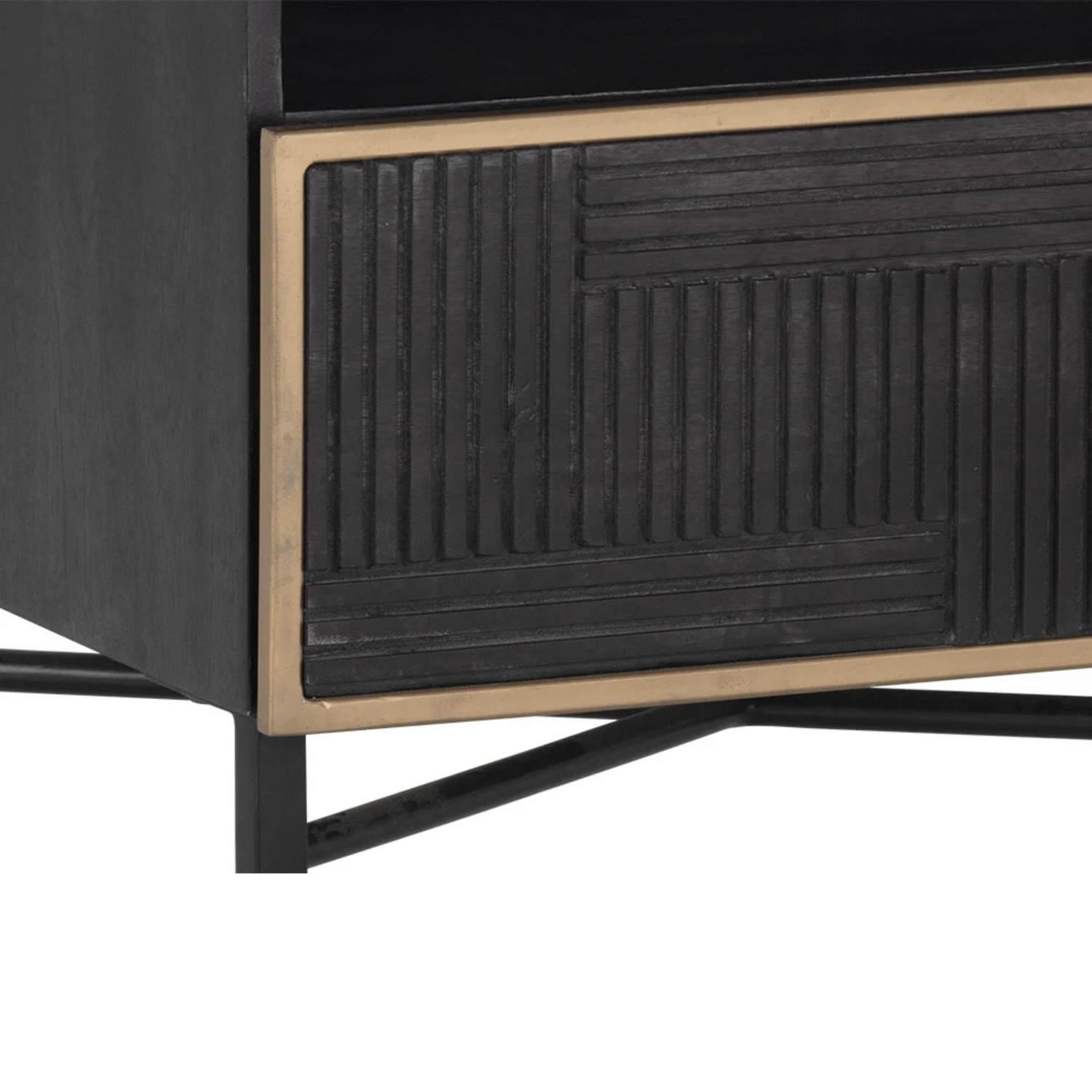 Influenced by global travels, skilled artisans use intricate woodworking techniques to bring the Markwood nightstand to life. The eye-catching dark brown mango wood and antique brass frame result in a modern look. Features shelving and a drawer for ample storage.