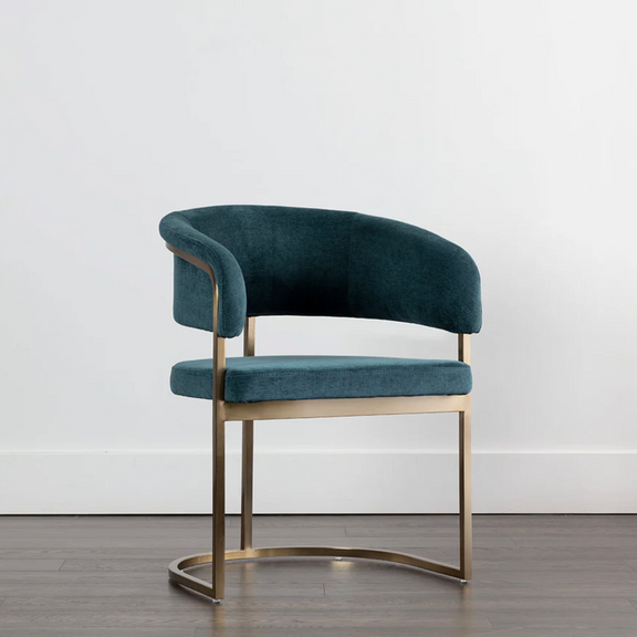 Uniting the beauty of sleek modern design with timeless elegance, the Marris Dining Armchair is a great addition to any dining space. Stocked in danny teal fabric and completed with a cantilever frame in a gold stainless steel finish.