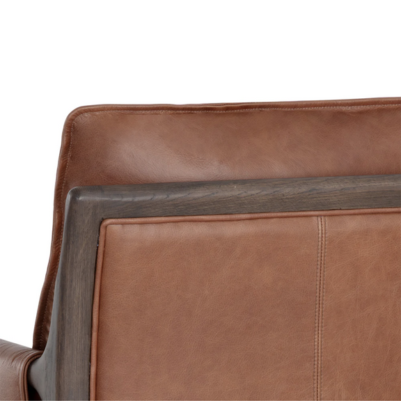 With influence from vintage design, this lounge chair evokes a charming and rustic mid-century appeal. Upholstered in shalimar tobacco leather with dual buckle flap detailing on the armrests. Completed with a brown solid oak wood frame with gold finished metal foot caps. Handle with Care: This design has been crafted with 100% top grain leather. Leather is a natural material; as such, color variations, markings, wrinkles, grooves and light scratches are acceptable and appreciated characteristics. No two pieces are alike. As wood is an organic, porous material, these pieces will contain natural variation of texture and may also exhibit fine indentations and cracks. Wood pieces will also display a disparity of color and grain, and visible knots and burls that add to the character of each piece.