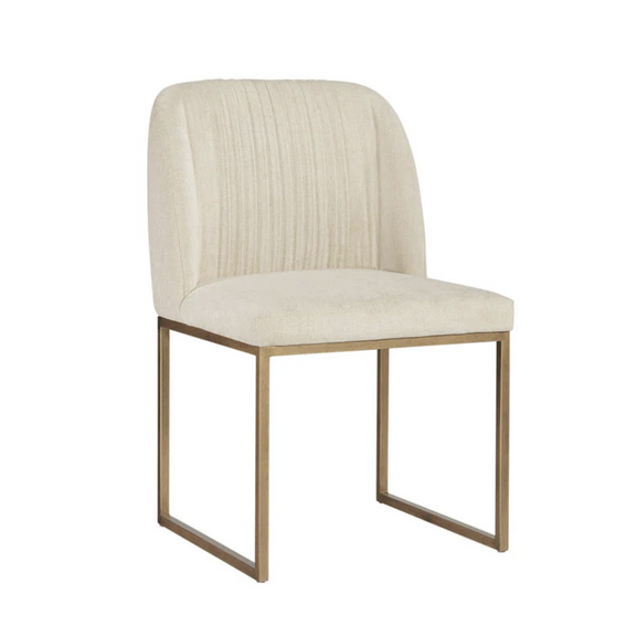 A modern dining chair that offers style and comfort. Features delicate ruching on the rounded seatback and exposed antique brass legs. Stocked in merlot fabric.