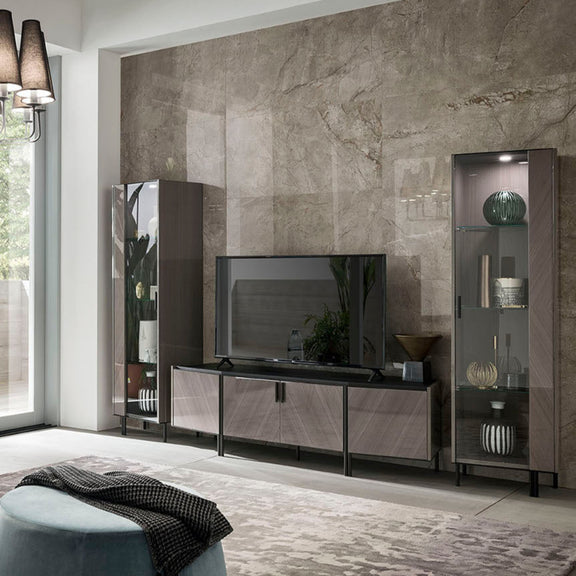 The sloping doors on the fronts create a play of reflections that shows off the high gloss finish of the eucalyptus.