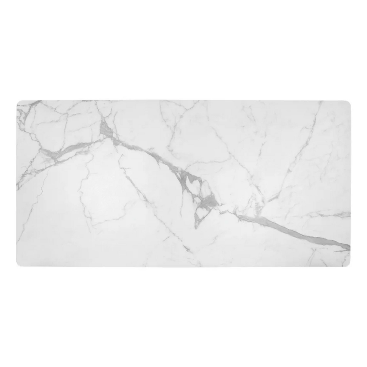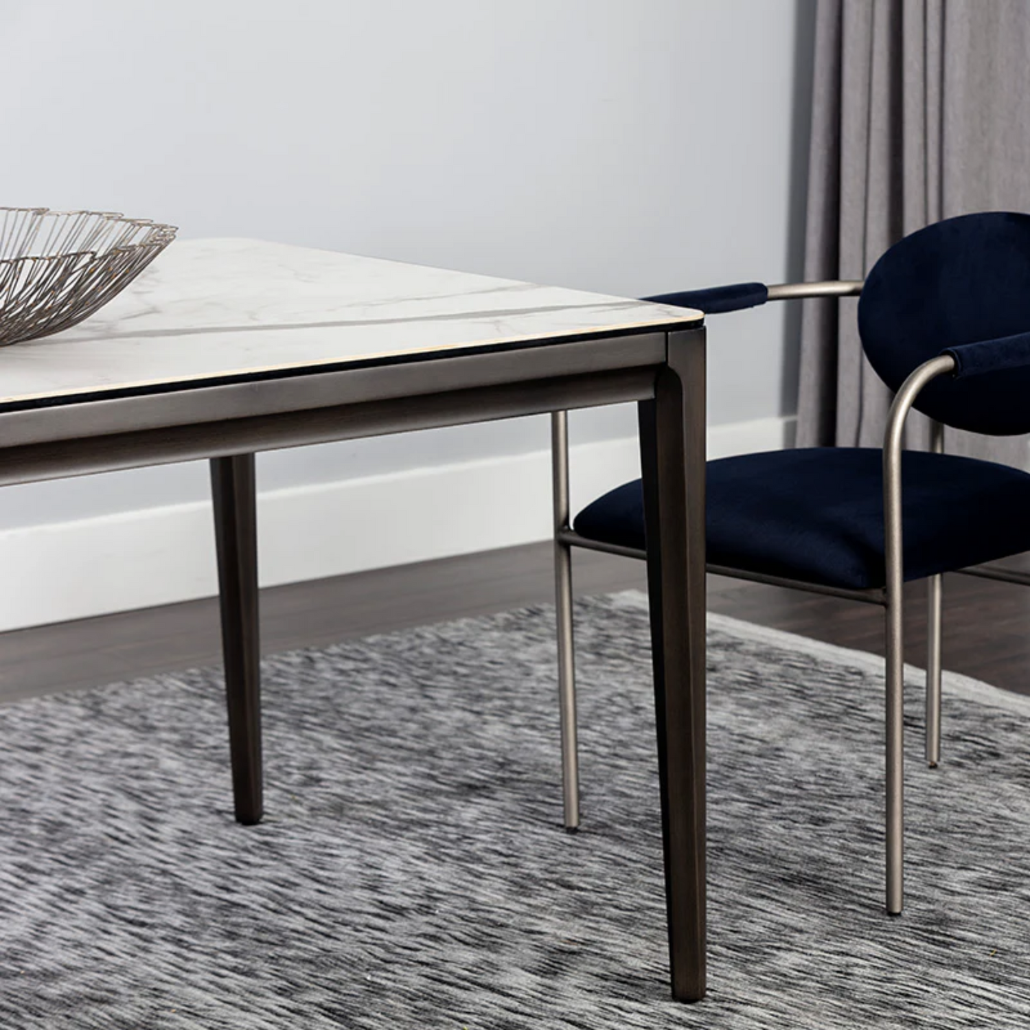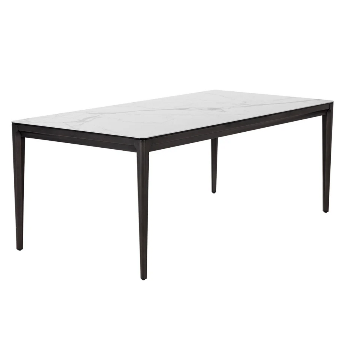 This mid-century modern dining table features clean lines with a sturdy silhouette. Designed with a white ceramic top with grey marble-look veining. Solid brown rubberwood legs complete this design. As wood is an organic, porous material, these pieces will contain natural variation of texture and may also exhibit fine indentations and cracks. Wood pieces will also display a disparity of color and grain, and visible knots and burls that add to the character of each piece.