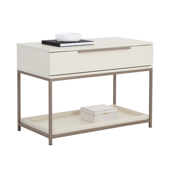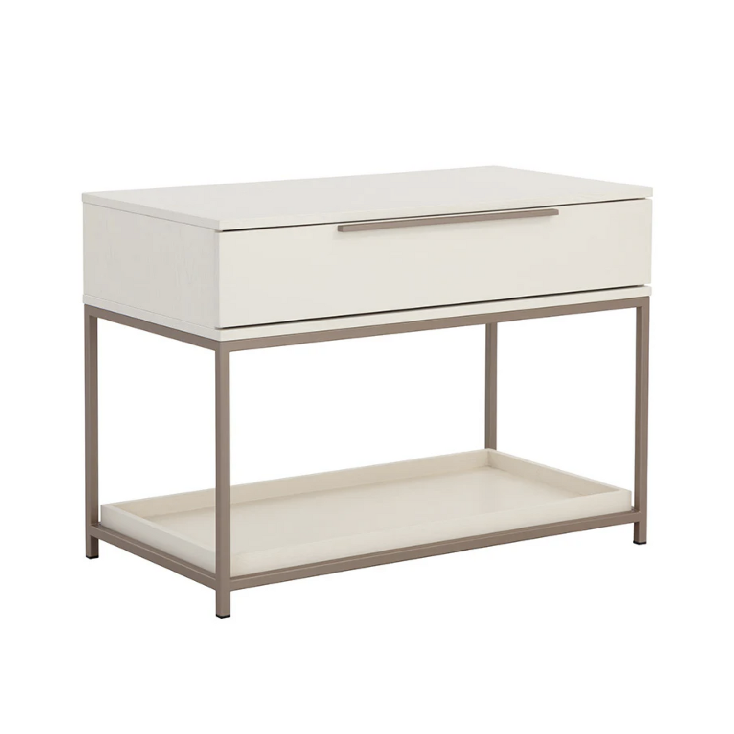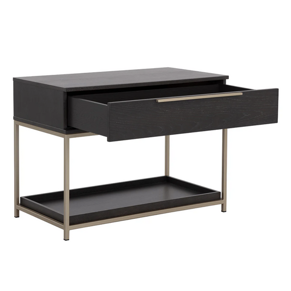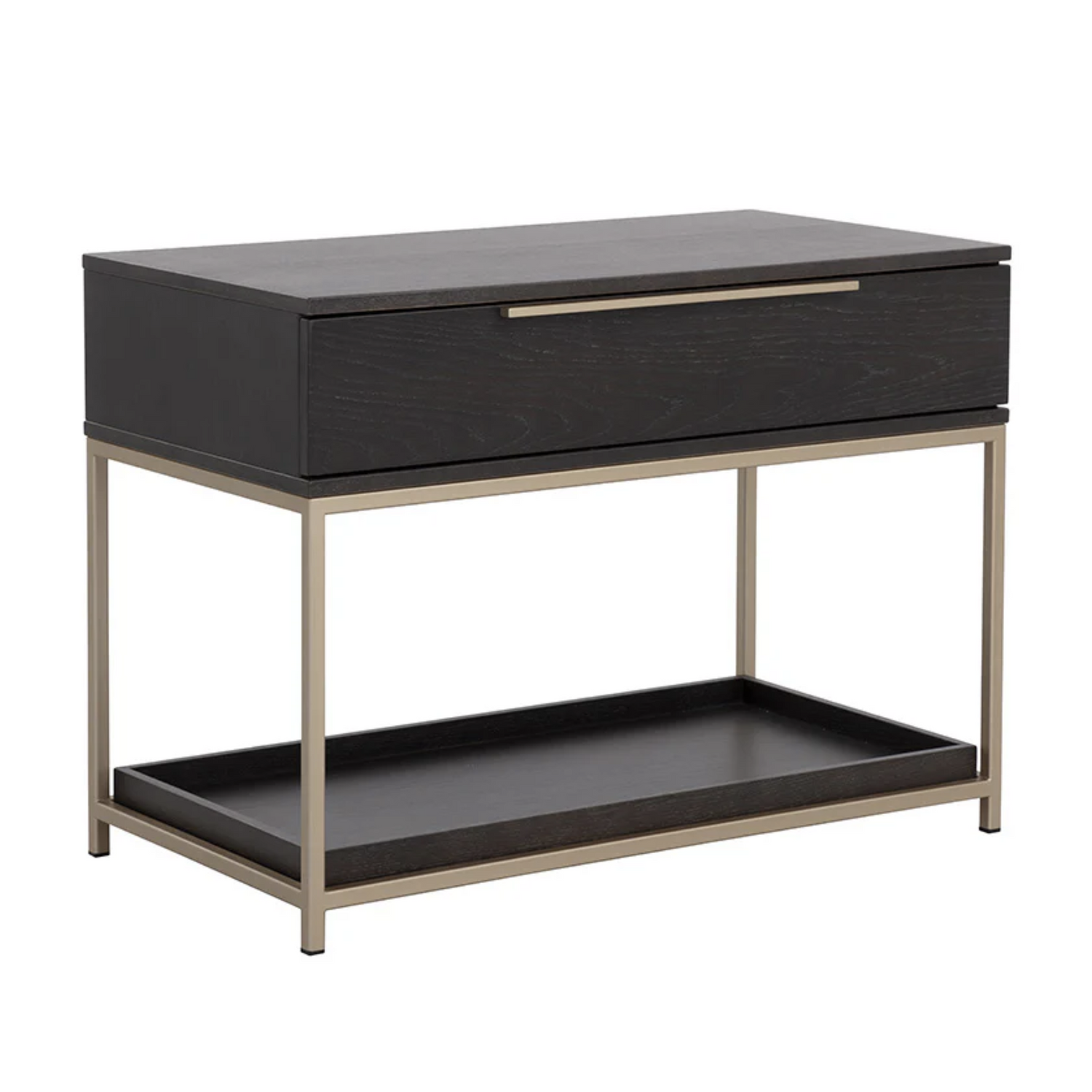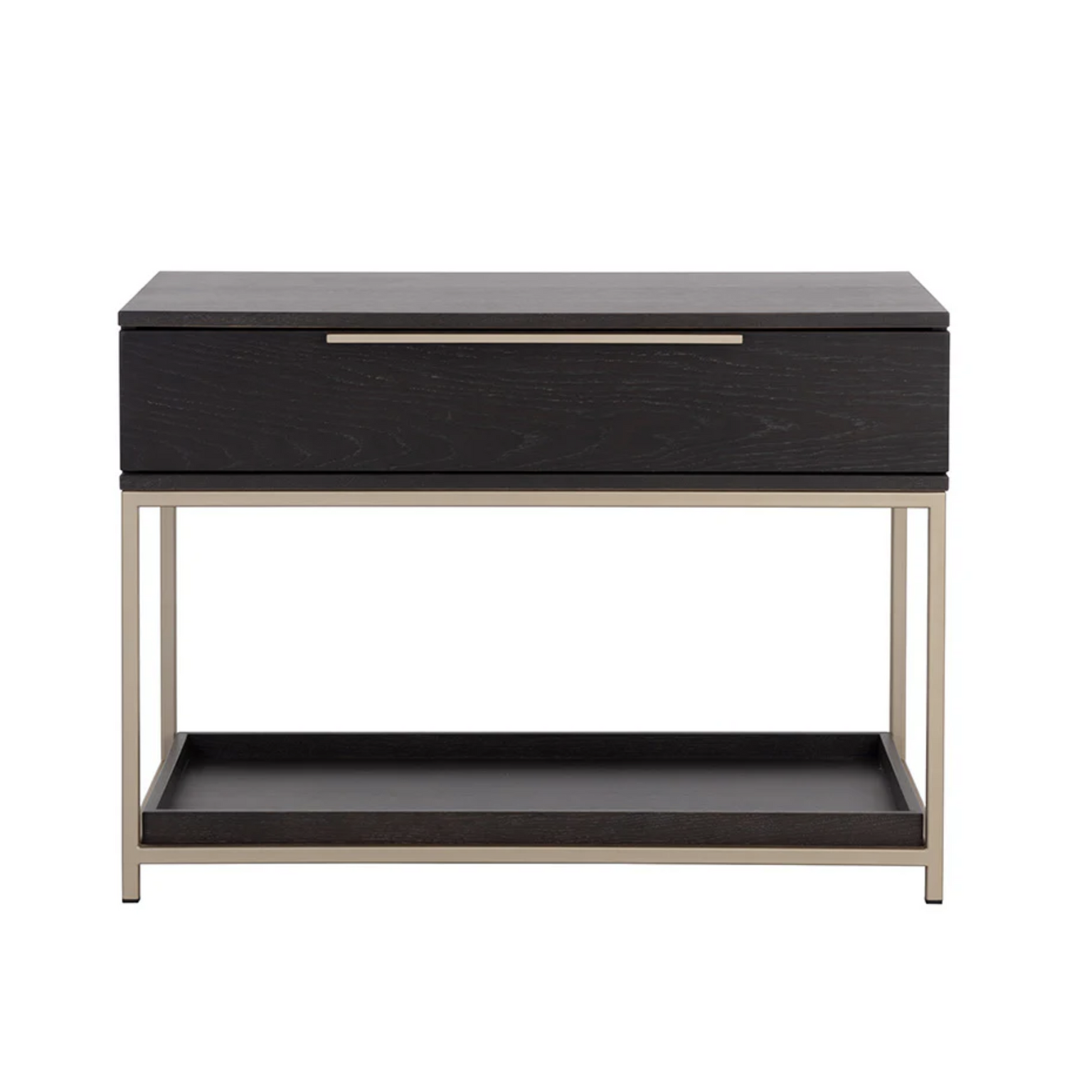 A modern nightstand designed to add a beautiful touch to the bedroom. Crafted from charcoal grey oak veneer with a large soft closing drawer and shelf for added storage. Brushed gold iron hardware completes the look. As wood is an organic, porous material, these pieces will contain natural variation of texture and may also exhibit fine indentations and cracks. Wood pieces will also display a disparity of color and grain, and visible knots and burls that add to the character of each piece.