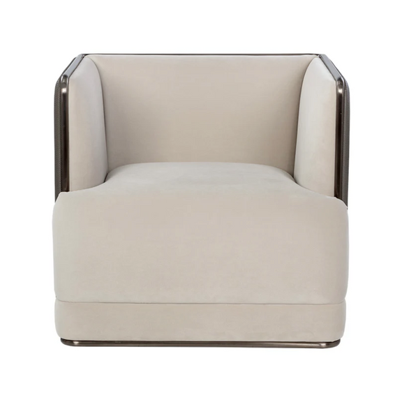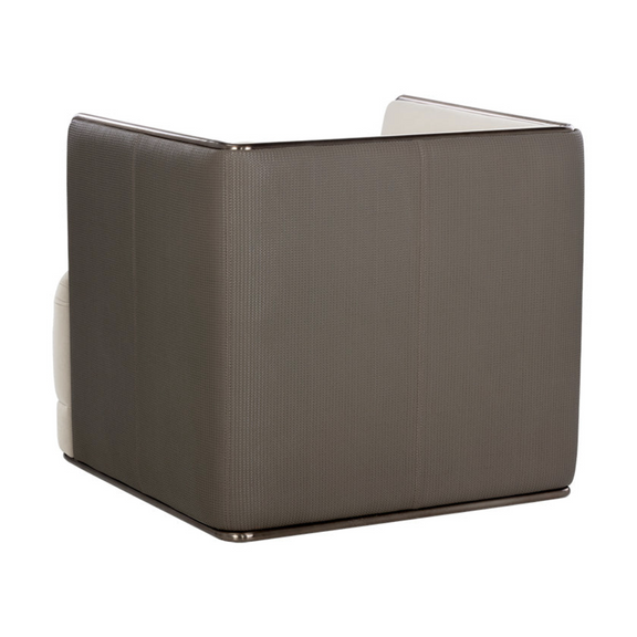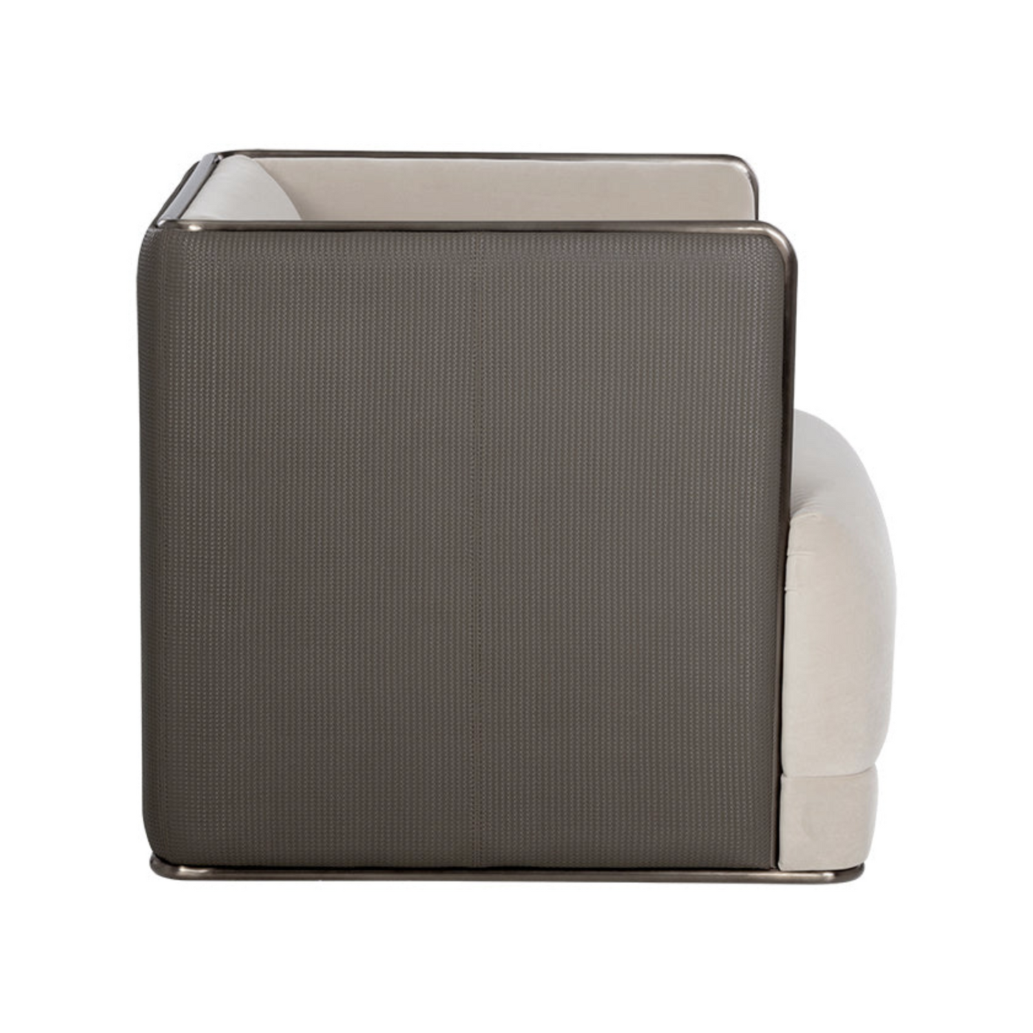 A bold form defines this modern and structured armchair that is guaranteed to turn heads. Features an interior upholstered in meg taupe fabric and an exterior in textured porcini taupe faux leather. Completed with an antique bronze stainless steel frame. Coordinating sofa also available. Handle With Care: This design has been crafted with faux leather. Faux leather is manufactured to reflect the natural characteristics of leather; as such, colour variations, markings wrinkles, grooves, and light scratches are appreciated characteristics. No two pieces will be alike.