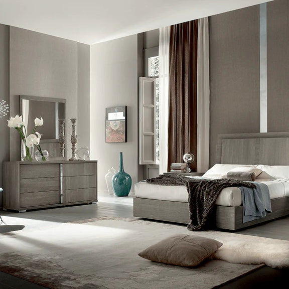 The innovative Grey oak eco veneer texture of the Tivoli bedroom furniture collection adds the warmth of wood to any bedroom whilst fully respecting the environment. The range includes bed, dresser, bedside tables, tall chest of drawers and mirror.
