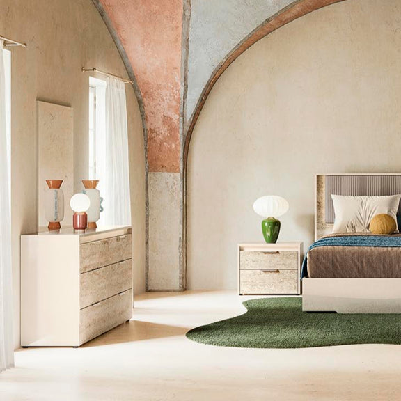 For the Tullia Collection, we paired a high-gloss Pearl Line finish with the refined elegance of Travertino Eco Stone, creating a sophisticated balance of modern and classic design.
